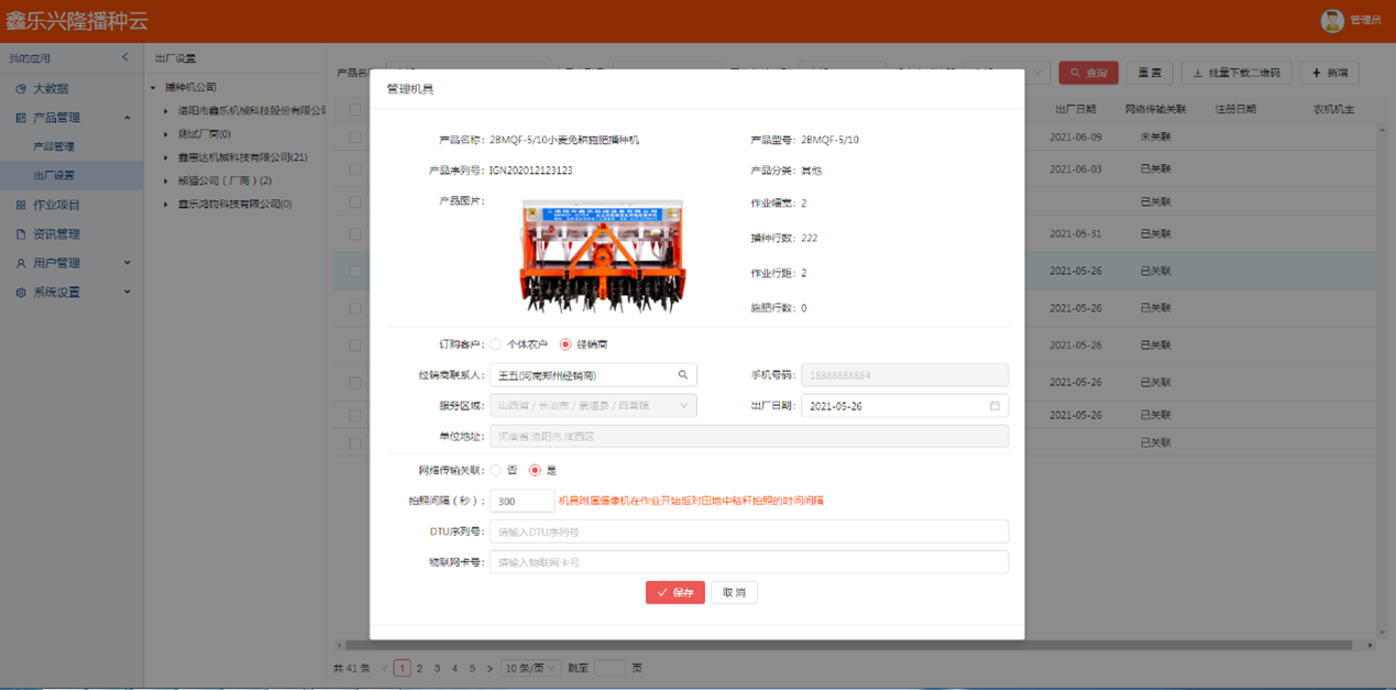 • 作業(yè)項目:為播種機(農(nóng)機)生產(chǎn)廠家和播種機(農(nóng)機)經(jīng)銷商提供作業(yè)項目跟蹤服務(wù)的功能。