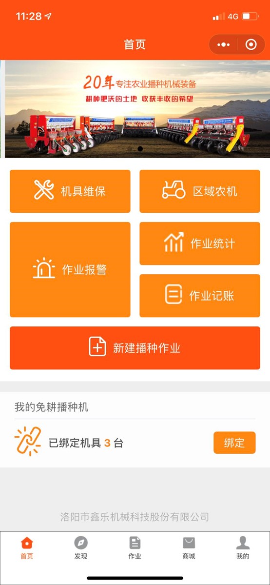 • 首頁:為登錄用戶提供創(chuàng)建作業(yè)、機具維保、區(qū)域農(nóng)機、作業(yè)報警、作業(yè)統(tǒng)計及作業(yè)記賬等重點功能的快捷入口。